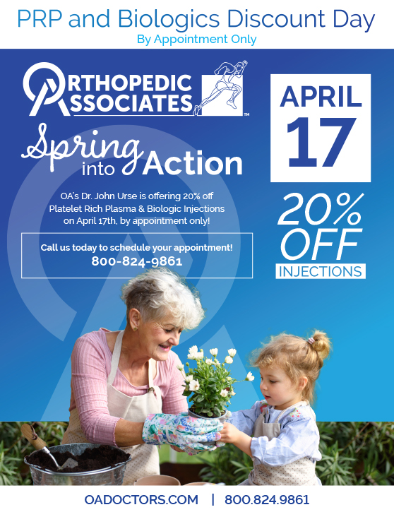 OA’s Dr. John Urse is offering 20% off Platelet Rich Plasma and Biologic Injections on April 17th, by appointment only!