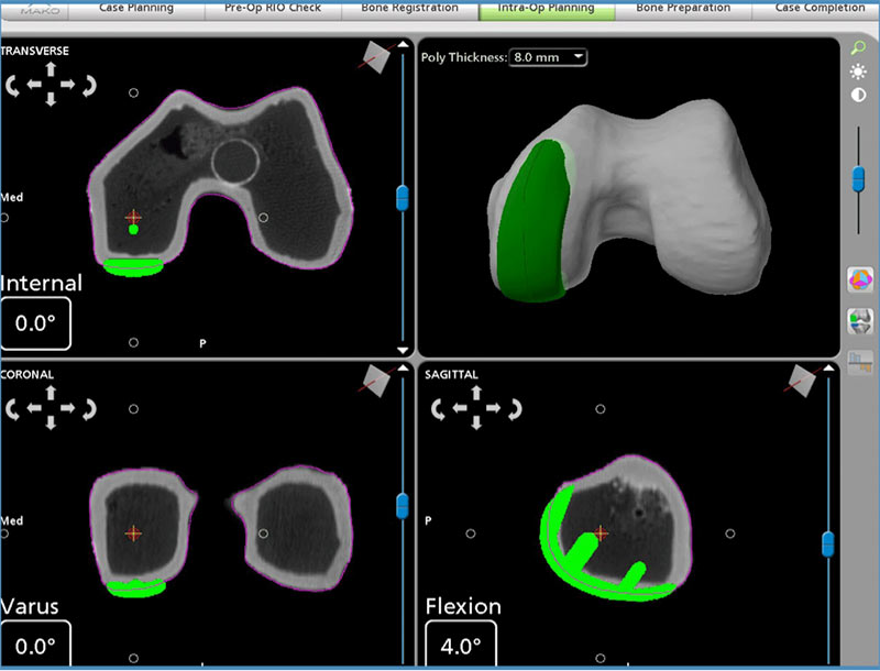 Mako Robotic-Arm Assisted Technology provides you with a personalized surgical plan based on your unique anatomy. First, a computerized tomography (CT) scan of the diseased hip or knee joint is taken. This CT scan is uploaded into the Mako System software, where a 3D model of your hip or knee is created. This 3D model is used to pre-plan and assist your surgeon in performing your joint replacement procedure.